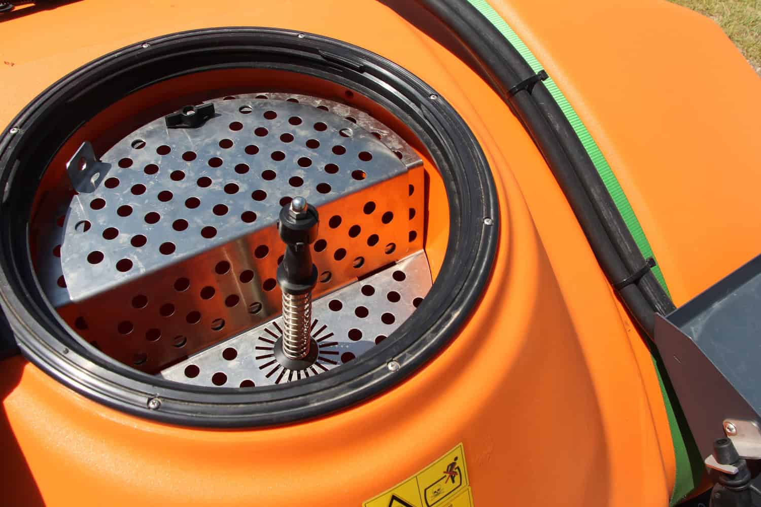 Sur la cuve de 1500l, Amazone a d’abord installé un mini poste de remplissage au niveau du trou d’homme. Il comprend notamment un rince bidons. Le constructeur a ensuite prévu une pompe à piston-membrane de 180 l/min (entraînement hydraulique). Mais aussi des filtres, une cuve de rinçage et une autre pour le lavage des mains.