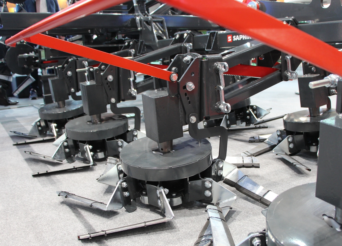 Le GrindStar, de Saphir, possède des rotors à axe vertical, auto-animés, de 75 cm de diamètre. Ils reçoivent des sortes de lames, conçues pour travailler le sol de façon superficielle. Mais, orientées quasiment à plat, elles ont aussi pour but de découper la végétation. Une action de mulchage, en fait. Le constructeur a disposé ces rotors en quinconce sur un châssis, chacun étant monté sur parallélogramme pour un suivi du sol précis.