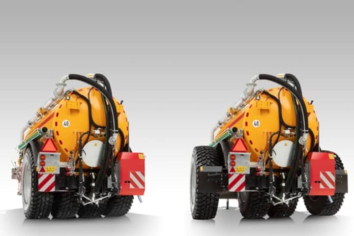 Pour réduire l’impact sur le sol, Veenhuis a adopté des roues de grand diamètre et un principe d’essieu télescopique. Ainsi, sur une simple essieu, une fois dans le champ, les roues passent à l’extérieur des traces du tracteur. Par contre, sur une double essieu, une première paire de roues suit celles du tracteurs tandis que l’autre passe à côté. D’autre part, il est possible de relever l’essieu avant et de reporter de la charge sur le tracteur, pour optimiser la traction.