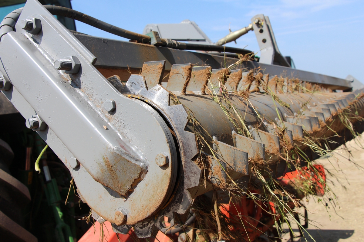 Ensuite, Benoît Malleron a tenté de compléter l’outil par une herse peigne. Elle avait pour but de trier les adventices les mettre en surface, et de secouer la terre restant collée aux racines. Mais n’efficacité n’était pas suffisante. Il est donc parti sur une solution plus énergique. Il s’agit d’un rouleau à pointes, entraîné par un moteur hydraulique. « J’ai utilisé un rouleau désileur, qu’il a juste fallu rallonger. Il tourne de manière à soulever la végétation et à aérer la couche travaillée. » Un système de cales permet d’en régler la profondeur.