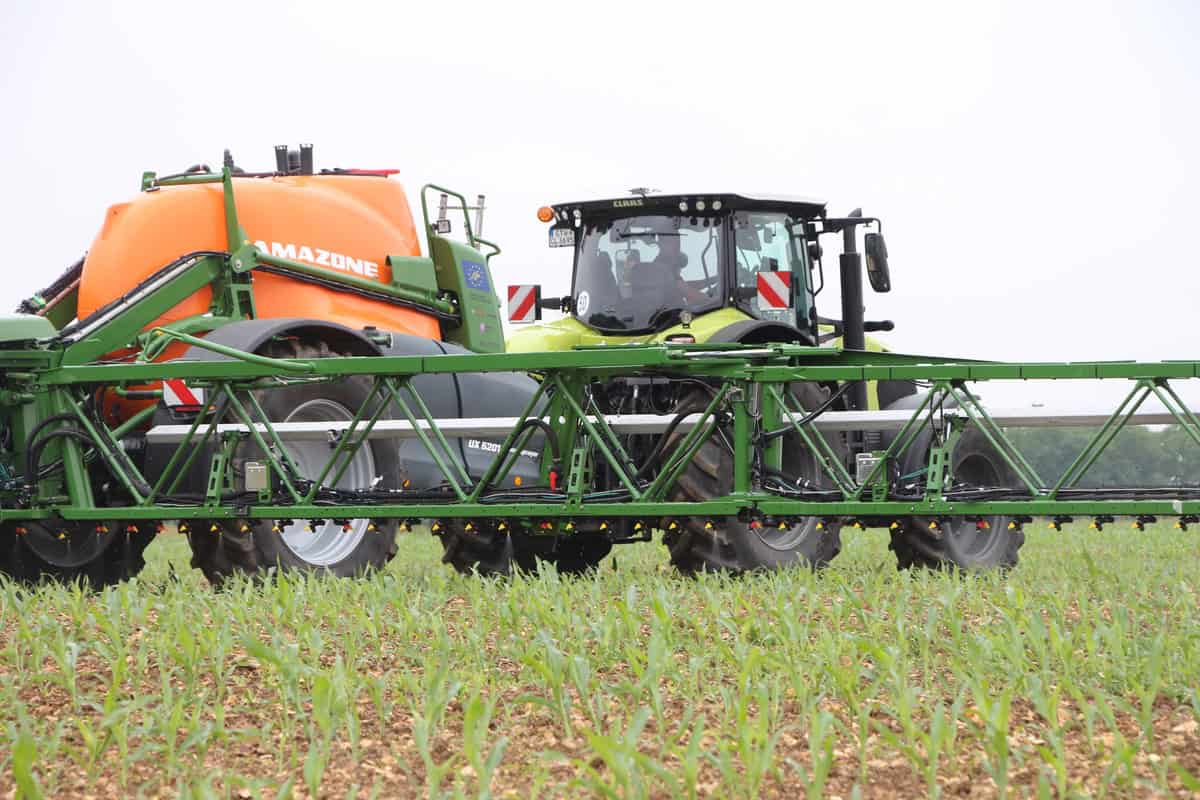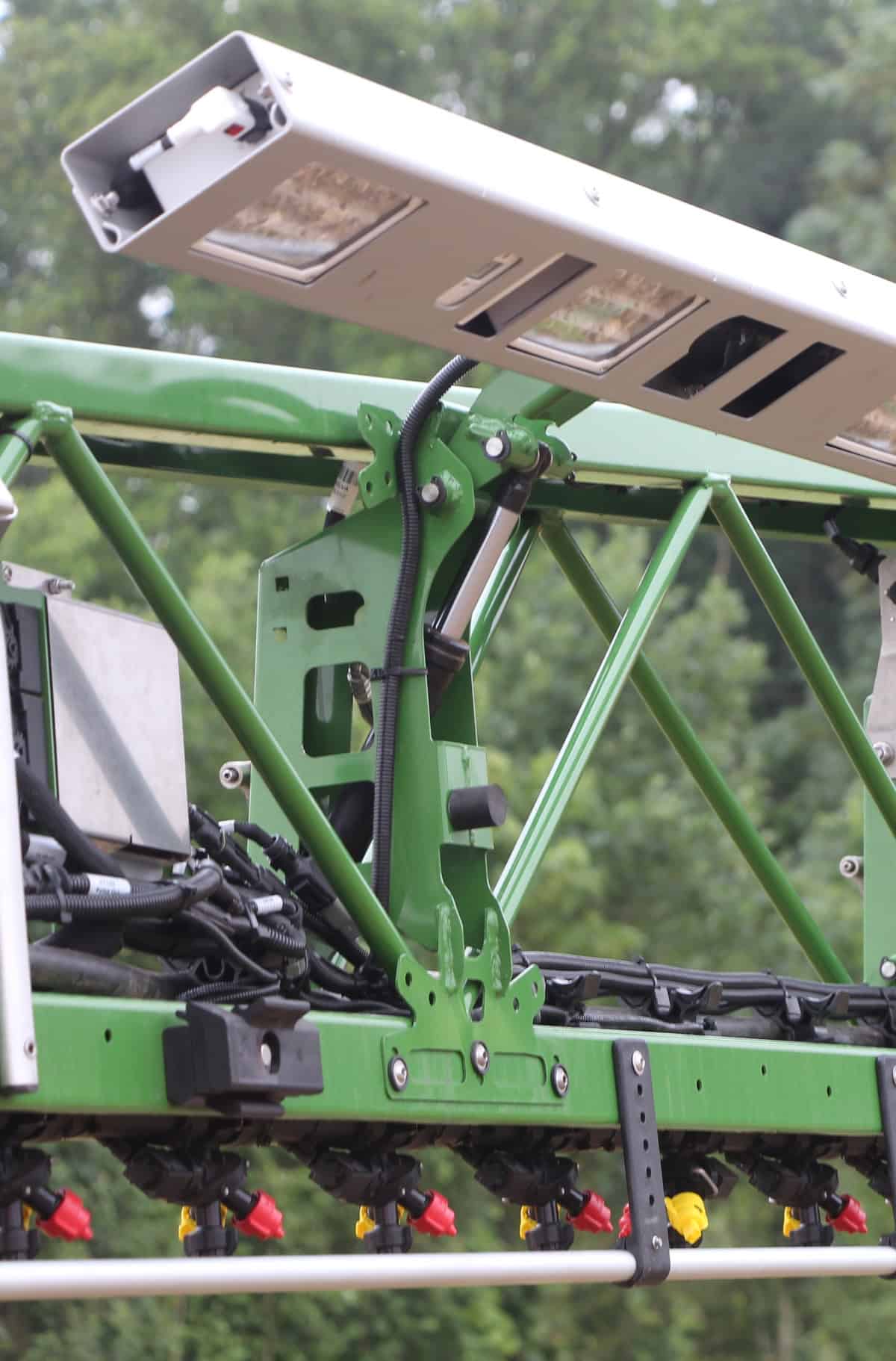 D’autre part, le pulvérisateur bénéficie de profondes modifications de la part d’Amazone. D’abord, le constructeur l’a équipé de buses à jet uniforme. Chacune traite sur seulement 25cm de large et bénéficie d’une ouverture fermeture propre ainsi que d’une modulation de durée et fréquence de coupure, dite PWFM. Cette technologie encore plus avancée que le PWM a pour but de maintenir la taille des gouttes malgré les changements de débit ou de pression. Ensuite, il a fallu renforcer la structure de la rampe pour supporter le supplément de poids dû au lampes et caméras. Mais aussi en revoir la géométrie pour garder possible le repliage.