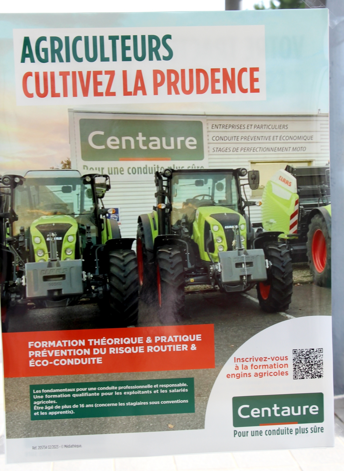 Le centre de formation à la conduite Centaure Futuroscope (Vienne) vient d’inaugurer une formation pour le monde agricole. « Elle vise à sensibiliser les exploitants au risque routier des engins agricoles ainsi qu’au respect de la réglementation et des normes en vigueur. » Au cours d’une journée, les stagiaires alternent des séances en salle et de la conduite sur piste fermée : chaussée glissante, freinage, évitement d’obstacles, manœuvres, etc. «Les fondamentaux pour une conduite professionnelle et responsable», annonce Centaure, filiale de Groupama. Un principe d’ailleurs initié par d’autres centres dans l’Est de la France.