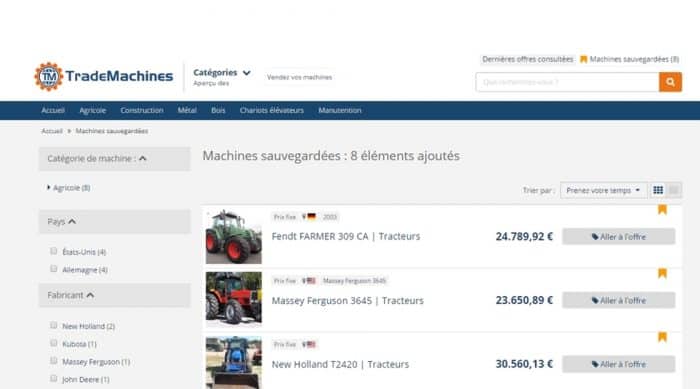 Le site TradeMachines.com arrive en France. Ce moteur de recherche compile des petites annonces de matériels d’occasion, en agricole mais aussi en manutention et industrie. Il affiche les offres disponibles sur le web et renvoie ensuite au site concerné lorsqu’on clique sur l’annonce. TradeMachines est basé en Allemagne, d’où la forte présence d’annonces de ce pays pour l’instant. Mais on devrait prochainement voir plus de propositions d’origine hexagonale. Le site estime regrouper environ 30% des offres de machines d’occasion en Europe.