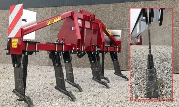 Guilbart a développé une lame droite à pointe décalée, pour les clients «souhaitant travailler de manière plus verticale». Elle est également réputée ne pas lisser le sol. Deux sections: 850X16 et 600X12, pointe au carbure boulonnée, adaptable sur les décompacteurs Guilbart et les Cuti-vie Durou.