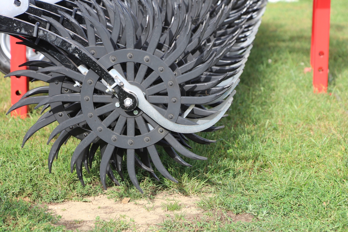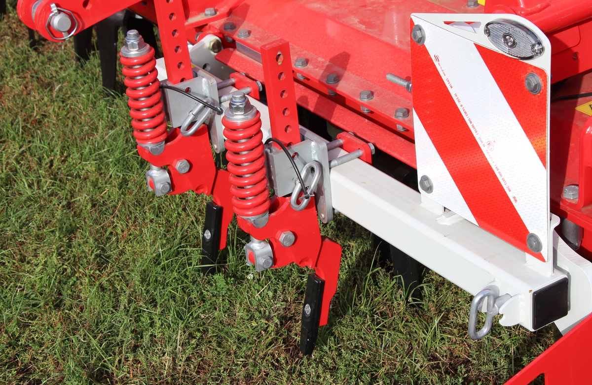 La machine reçoit des dents contrôlées chacune par un ressort (photo en début d’article). Elles délivrent la même pression au sol dans toutes les hauteurs de travail, tout en gardant un même angle d’attaque. Le réglage de l’agressivité se réalise depuis la cabine. Pöttinger a opté pour un écartement de 30 mm entre les passages de dents. Le premier modèle à sortir est une herse étrille de 12 m, pouvant travailler en 9 m en repliant mes extrémités. Côté désherbage mécanique, signalons aussi l’arrivée de pare pierres et d’un semoir à petites graines (régénération de prairies) sur les houes rotatives Rotocare. Autre évolution : le relevage individuel des éléments selon une cartographie GPS pour les bineuses Flexcare.