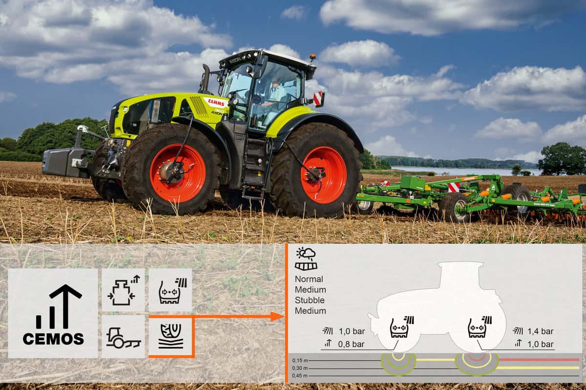 Mais la solution la plus récente se présent sous la forme d’une préconisation. Il s’agit du Cemos avec Terranimo, médaille d’argent à l’Agritechnica. Issu de travaux universitaires, le logiciel Terranimo affiche le risque de tassement des sols en fonction des conditions de travail et du matériel concerné. Ajouté aux fonctions initiales du Cemos, sans supplément de prix, il contribue à une meilleure information du conducteur du tracteur. Ce dernier obtient en effet des conseils de lestage et de pression des pneus de manière à préserver l’état du sol. Précision: le Cemos n’est pas encore proposé sur les tracteurs Xerion, car leur architecture demande de développer des algorithmes différents de ceux des tracteurs conventionnels.