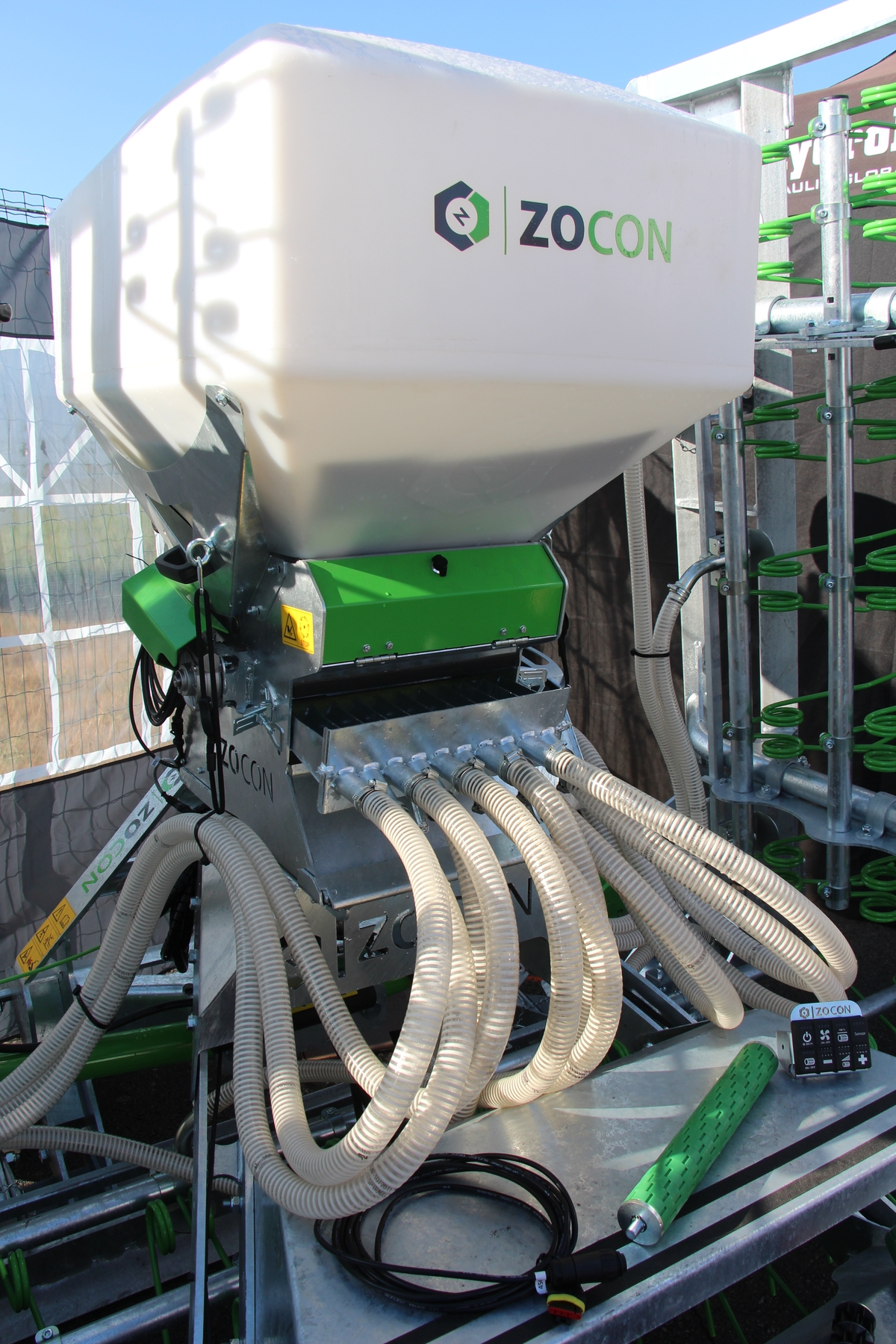 On passe à l’élevage avec la marque néerlandaise Zocon. Elle exposait au Space son Greenkeeper Plus (photo en début d’article), une herse à prairie dotée d’un dispositif de semis très complet. La herse reçoit une lame niveleuse et des dents doubles de 10 mm de diamètre. Des roues de jauge à l’avant et à l’arrière assurent le suivi du sol. Le semoir Greenseeder, de conception maison, possède des bobines facilement interchangeables en fonction du calibre de la semence. D’autre part, il bénéficie d’un petit bac d’étalonnage et d’une régulation DPA. Zocon a fait le choix de ne pas doter l’appareil d’un rouleau, pour éviter le repiquage de la végétation indésirable extirpée par les dents. Largeur : 3, 6 et 8 m. Capacité du semoir : 150, 300 ou 450 l. Ce dernier se démonte aisément pour l’installer par exemple sur un déchaumeur. Prix de l’ensemble en 6 m : à partir de 11540 €.