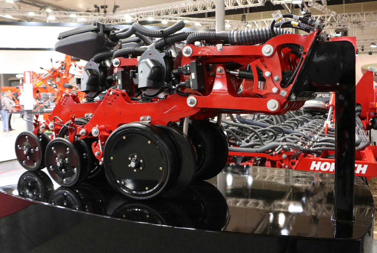 Le premier prototype, dévoilé par Philipp Horsch, possède 47 rangs, pour une largeur de travail de 10,60 m. Le responsable du dossier explique qu’un écartement de 25 cm pourrait aussi s’envisager, afin de retrouver des inter-rangs standards de 50 et 75 cm en débrayant une partie des éléments.