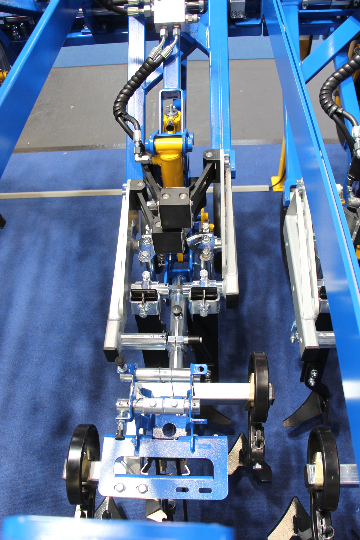 La nouvelle bineuse de précision Treffler THP se distingue par deux caractéristiques particulières. Premièrement, ses éléments de binage se présentent comme des parallélogrammes horizontaux réglables en continu. Ainsi, depuis la cabine, le chauffeur peut approcher les dents plus ou moins près du rang, en tout point de la parcelle pour tenir compte des hétérogénéités.
