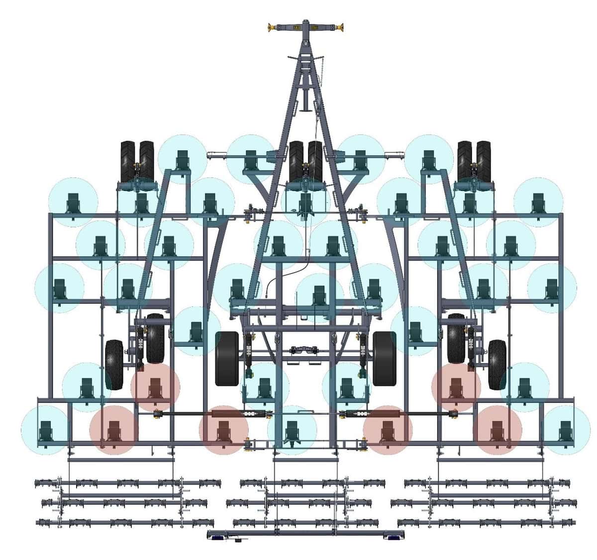 Le scalpeur Methys PCS de Sky Agriculture est défini comme «sans compromis technique». La conception de cet outil à dent a fait l’impasse sur un rouleau, qui en réduirait l’efficacité. Seul un peigne complète l’action des socs, pour obtenir l’effet recherché sur les adventices. Pour une largeur de travail de 6 ou 8m, le Methys PCS compte 12 roues de contrôle de profondeur. Le but est en effet de travailler à faible profondeur tout ensuivant précisément le sol. Le constructeur a réparti les dents sur 7 rangées pour réduire le foisonnement de la terre. Le dégagement y gagne également. D’autre part, le profil des dents vise à concilier une bonne pénétration et un effet de retournement sans mélange.
